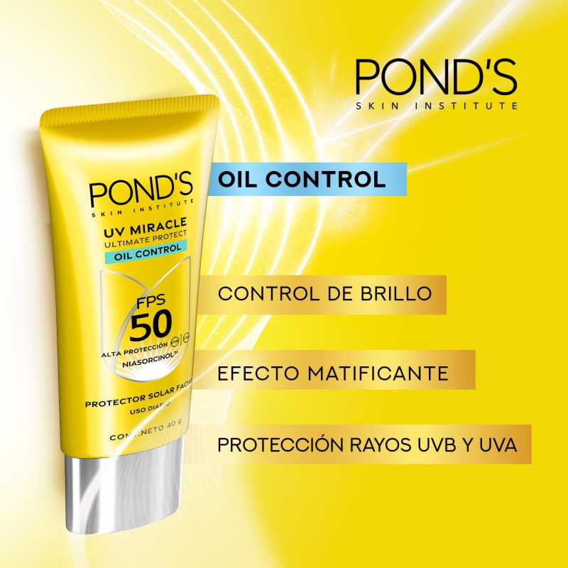 - UV MIRACLE Oil Control FPS 50: Protege contra los rayos UVA y UVB a la vez que repara el exceso de oleosidad, matificando al instante y controlando el brillo hasta por 12 horas. ¡Ideal para pieles mixtas a grasas!