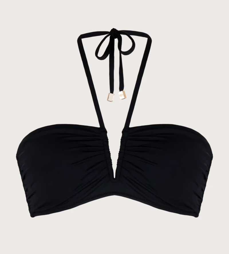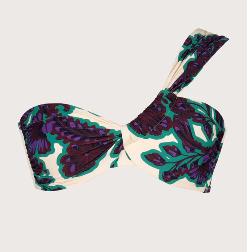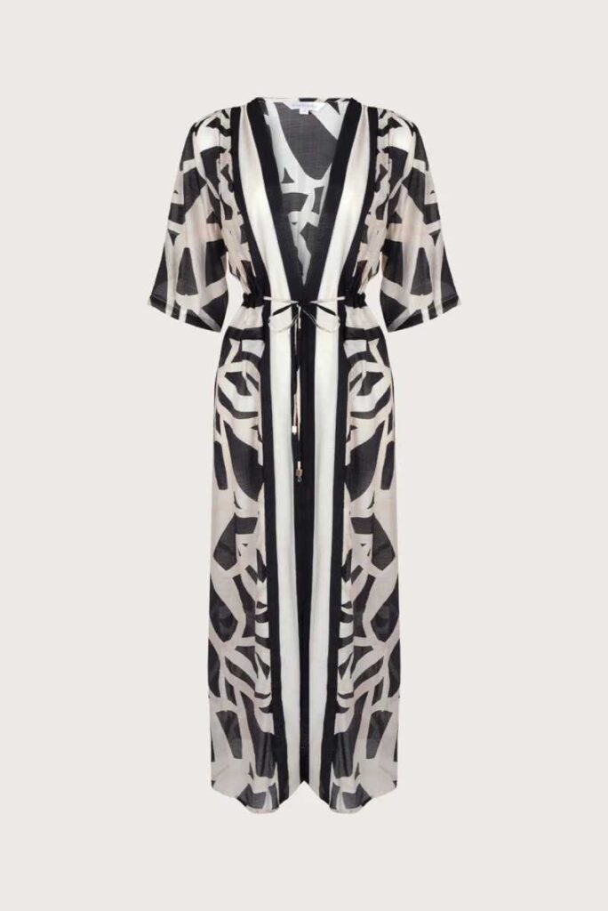 Elige un bikini con estampado artístico y una túnica fluida, abierta, como vestido playero. Lleva un pañuelo a juego. Botas cowboy o sandalias, según tu mood. Ideal para ir del mar a pasear, o del hotel al atardecer.
