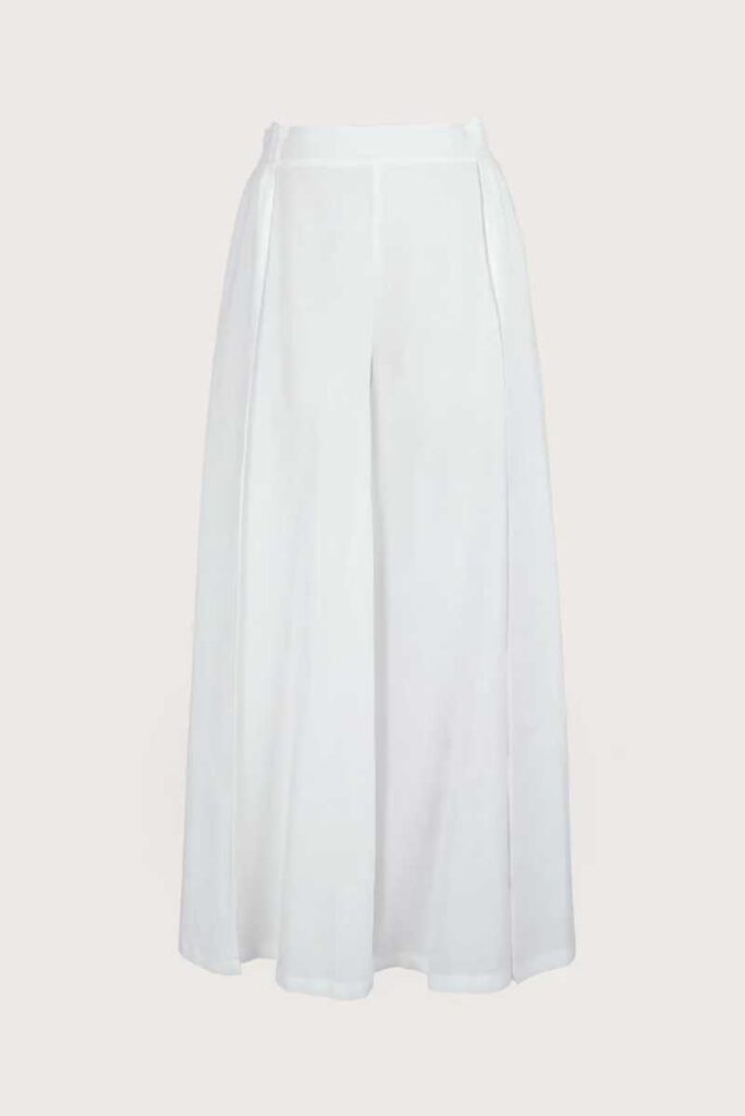 Combina un bikini top estructurado con una falda larga de lino vaporoso. Suma textura y movimiento. Cambia las sandalias por unas plataformas de yute, un collar dorado oversized, y remata con un bolso crossbody tejido. Serás la definición de effortless chic: fresca, elegante, inolvidable.