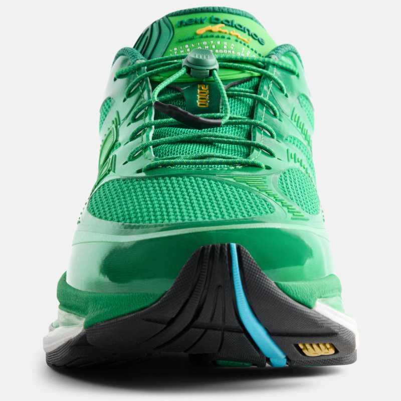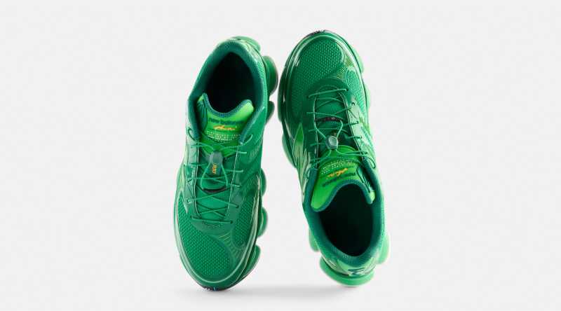 Para esta colaboración, Aminé reviste toda la parte superior del calzado con malla mesh verde brillante y capas tonales sintéticas de acabado lustroso. El diseño se complementa con un bordado distintivo en el talón y una etiqueta en la lengüeta con ambos logotipos, marcando la colaboración.